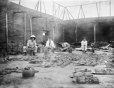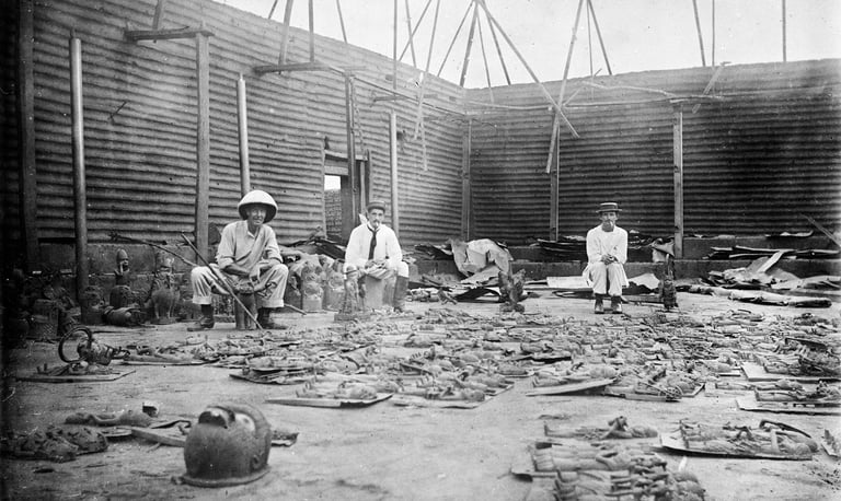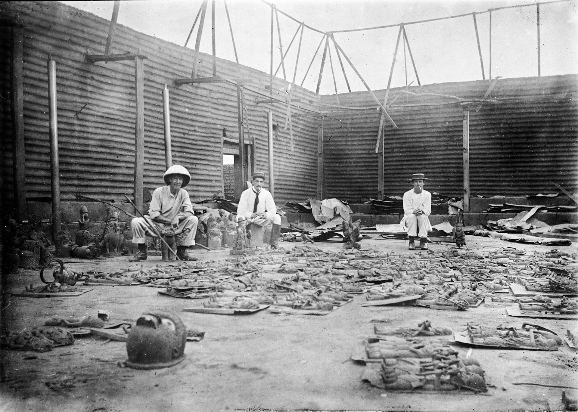 Burnt interior of Oba's compound during the siege of Benin City (present day Nigeria) , with bronze plaques and three British soldiers of the Benin Punitive Expedition in February, 1897.