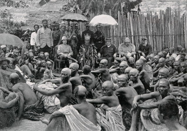 Photograph of the ceremony which formally incorporated the Ewi of Ado's kingdom in the British Lagos Protectorate. Ado was one of several Yoruba kingdoms situated in what is now Nigeria. Used as part of an online exhibition about the "Scramble for Africa".