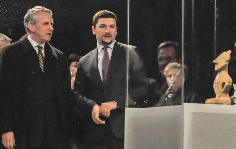 Kosovo minister of Science and Art Memli Krasniqi reviewing arheological artefacts returned from Germany after decades.