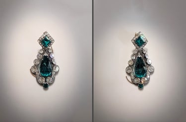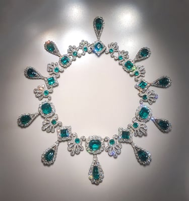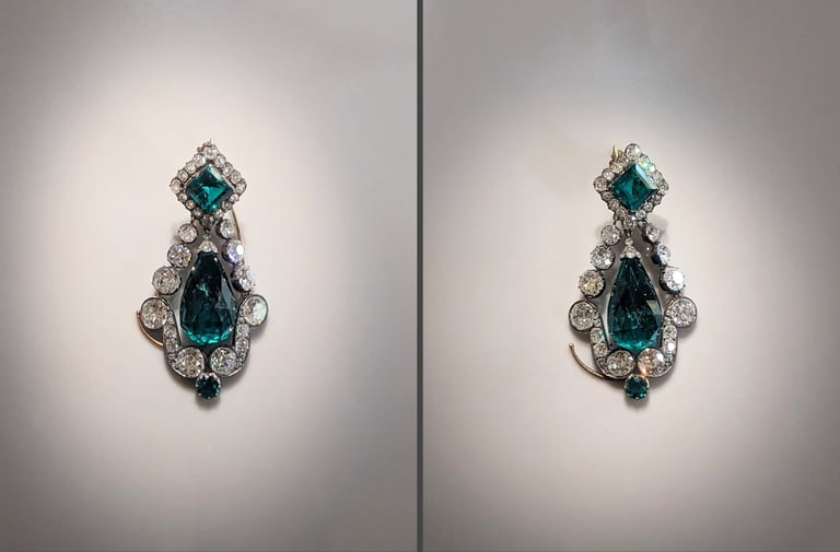 Marie-Louse necklace made out of emeralds, large corsage bow belonging to Empress Eugénie and pair of emerald earrings from Marie Louise's jewelry set. Photo: Shonagon, via Wikimedia Commons (CC0).